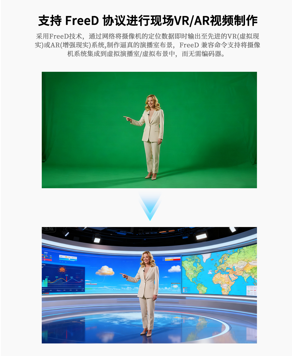 采用FreeD技術,通過網絡將攝像機的定位數據即時輸出至先進的VR(虛擬現實)或AR(增強現實)系統,制作真的演播室布景,FreeD兼容命令支持將攝像機系統集成到虛擬演播室/虛擬布景中,而無需編碼器。