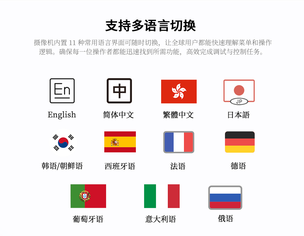 攝像機內置 11 種常用語言界面可隨時切換,讓全球用戶都能快速理解菜單和操作邏輯。確保每一位操作者都能迅速找到所需功能,高效完成調試與控制任務。