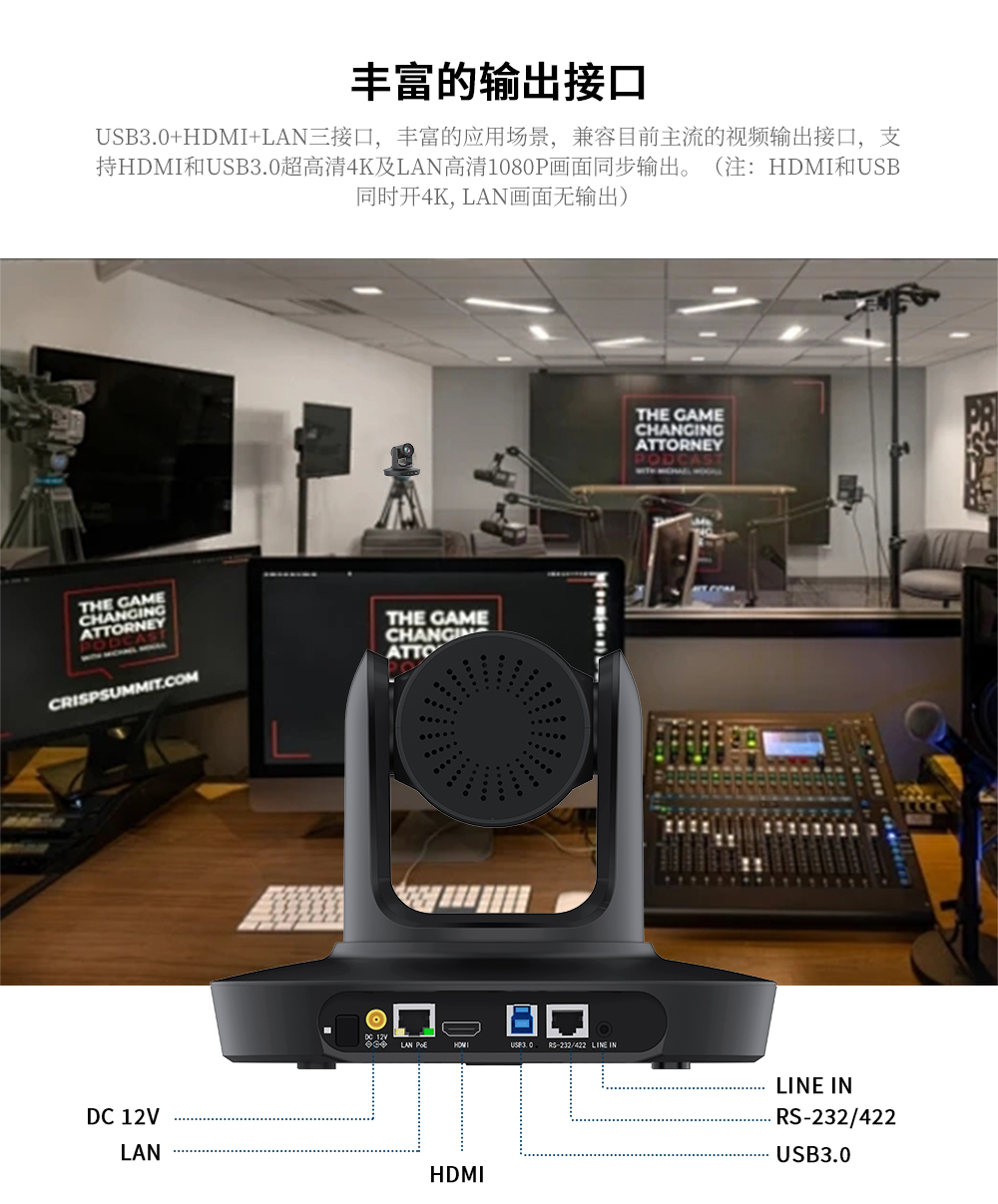 USB3.0+HDMI+LAN三接口,豐富的應用場景,兼容目前主流的視頻輸出接口,支持HDMI和USB3.0超高清4K及LAN高清1080P畫面同步輸出。(注:HDMI和USB同時開4K, LAN畫面無輸出)