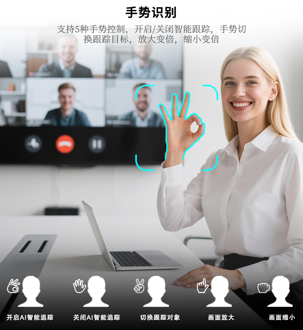 支持5種手勢控制,開啟/關閉智能跟蹤,手勢切換跟蹤目標,放大變倍,縮小變倍
