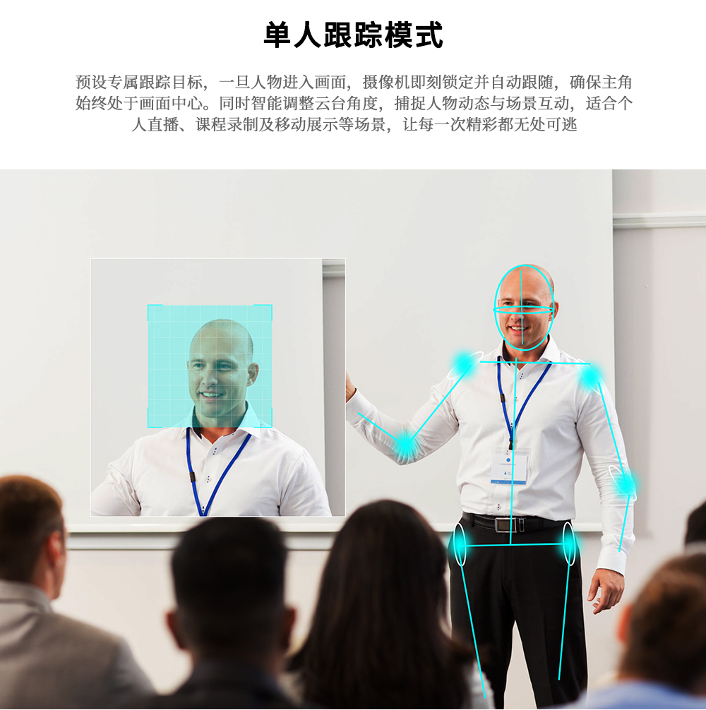 預設專屬跟蹤目標,一旦人物進入畫面,攝像機即刻鎖定并自動跟隨,確保主角始終處于畫面中心。同時智能調整云臺角度,捕捉人物動態與場景互動,適合個人直播、課程錄制及移動展示等場景,讓每一次精彩都無處可逃