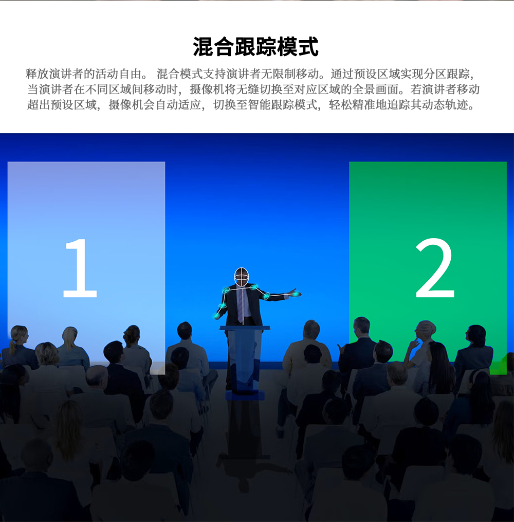 釋放演講者的活動自由。 混合模式支持演講者無限制移動。通過預設區域實現分區跟蹤,當演講者在不同區域間移動時,攝像機將無縫切換至對應區域的全景畫面。若演講者移動超出預設區域,攝像機會自動適應,切換至智能跟蹤模式,輕松精準地追蹤其動態軌跡。