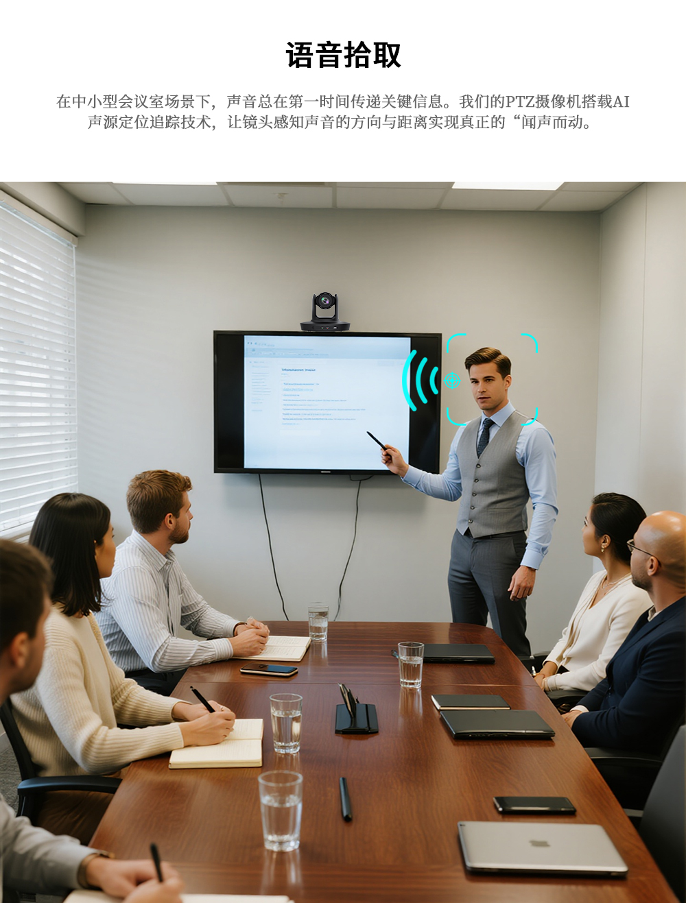 在中小型會議室場景下,聲音總在第一時間傳遞關鍵信息。我們的PTZ攝像機搭載AI聲源定位追蹤技術,讓鏡頭感知聲音的方向與距離實現真正的“聞聲而動”。