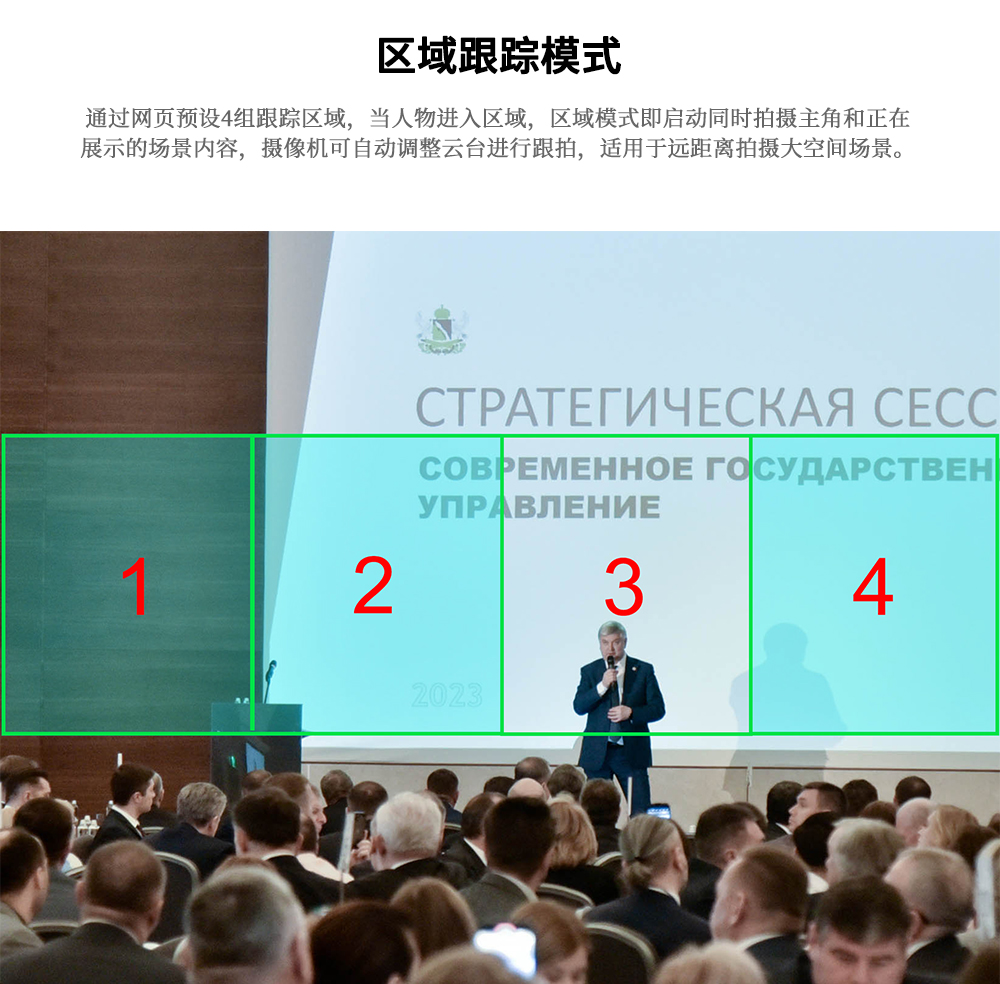 通過網頁預設4組跟蹤區域,當人物進入區域,區域模式即啟動同時拍攝主角和正在展示的場景內容,攝像機可自動調整云臺進行跟拍,適用于遠距離拍攝大空間場景。