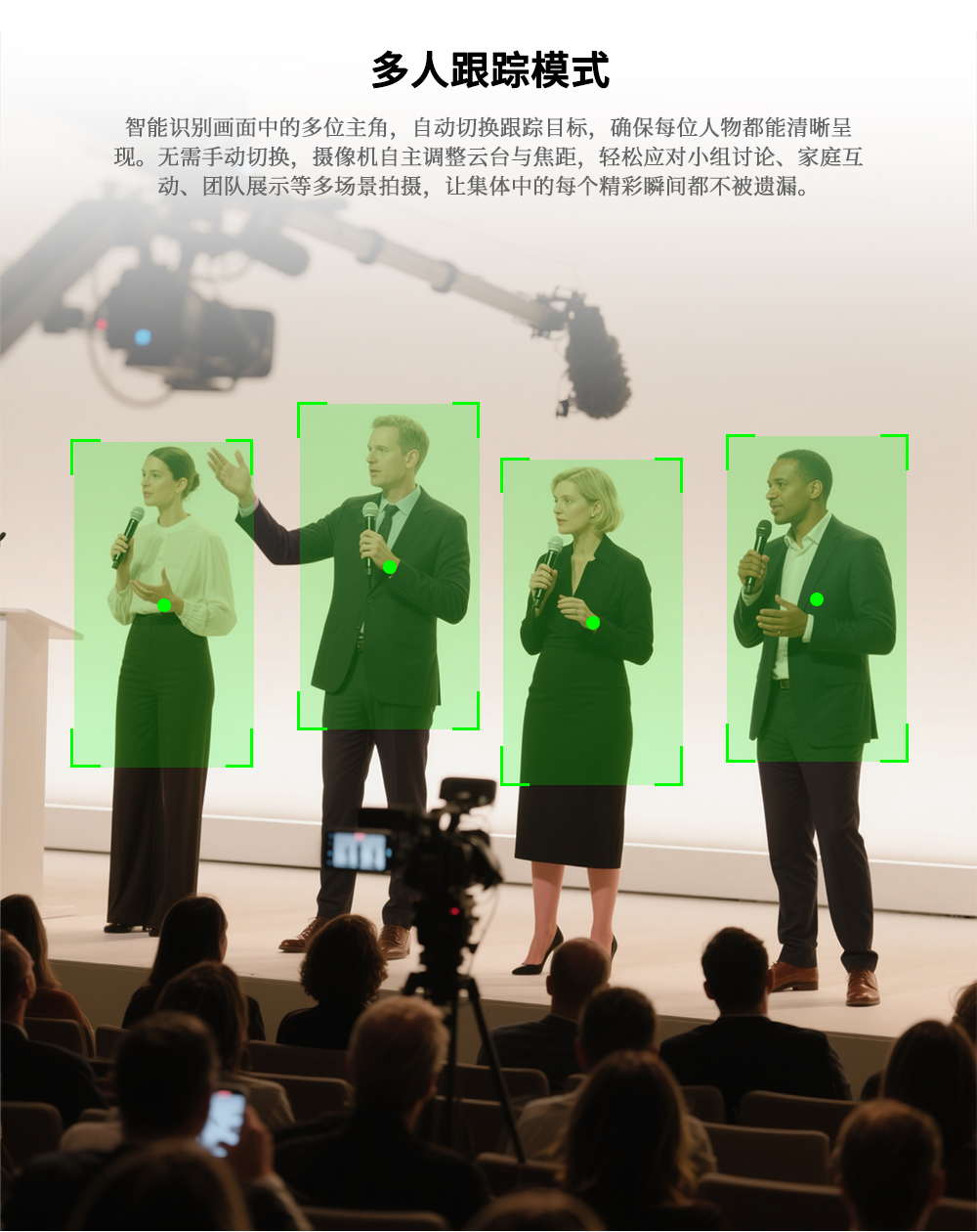 智能識別畫面中的多位主角,自動切換跟蹤目標,確保每位人物都能清晰呈現。無需手動切換,攝像機自主調整云臺與焦距,輕松應對小組討論、家庭互動、團隊展示等多場景拍攝,讓集體中的每個精彩瞬間都不被遺漏。