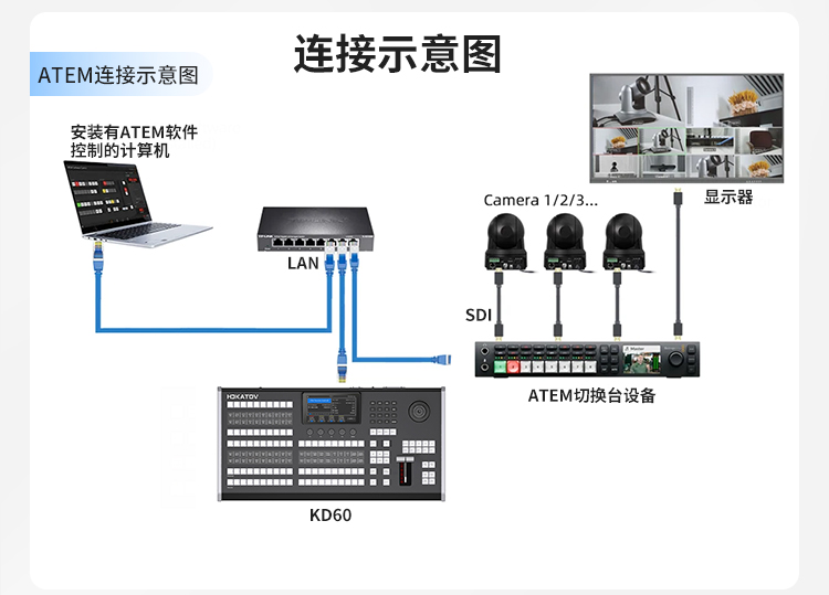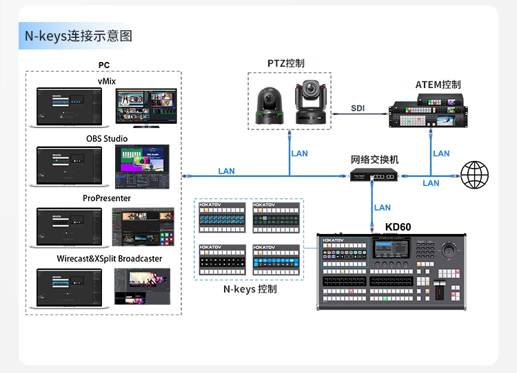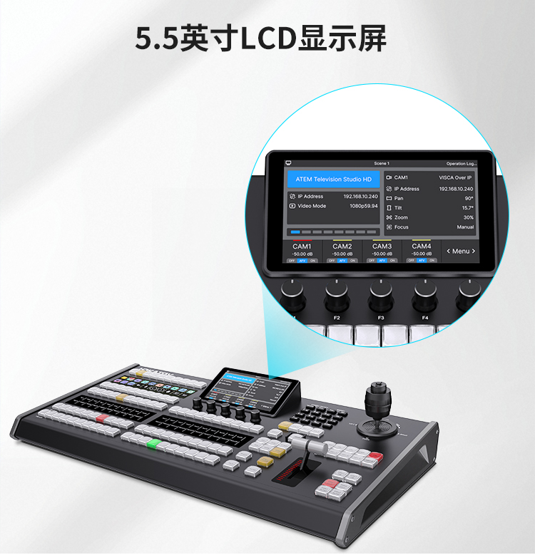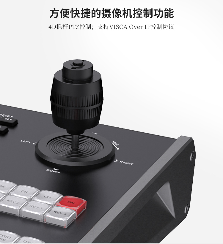KD60配備高精度4D搖桿,支持VISCA Over IP協議,實現平移、俯仰、變焦、對焦等PTZ操作快速響應,輕松應對多角度拍攝需求,適用于多機位直播、會議及演播室環境。