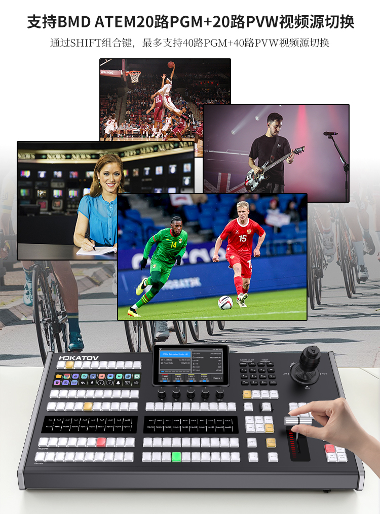 KD60支持ATEM全接口,默認配置下提供20 路PGM+20路PVW切換通道。通過SHIFT鍵擴展,最多可支持40路PGM或40路PVW,滿足復雜演播、賽事直播、活動導播等多場景大規模信號調度需求。