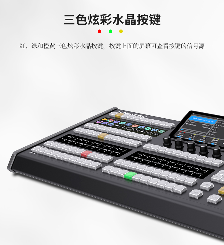 紅/白、綠/白和橙黃/白雙色炫彩水晶按鍵,高透水晶鍵帽在強光或暗光環境下均能清晰識別,滿足各類專業導播環境需求。