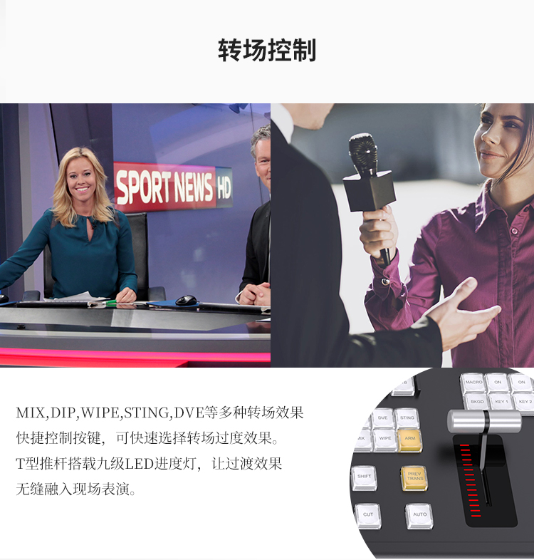 內置MIX、DIP、WIPE、STING、DVE 等多種轉場快捷按鍵,輕松切換所需過渡效果。T-BAR推桿配合LED燈進度條,實現精準、順滑的現場轉場控制,提升導播流暢度與專業感。