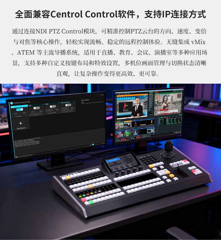 通過連接NDI PTZ Control模塊,可精準控制PTZ云臺的方向、速度、變倍與對焦等核心操作,輕松實現流暢、穩定的遠程控制體驗。無縫集成 vMix、ATEM 等主流導播系統,適用于直播、教育、會議、演播室等多種應用場景,支持多種自定義按鍵布局和特效設置,多機位畫面管理與切換狀態清晰直觀,讓復雜操作變得更高效、更可靠。